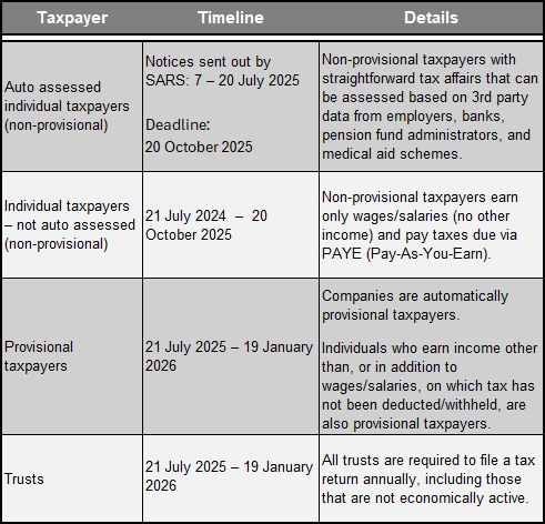 Provisional taxpayers (certain individual taxpayers and all companies) as well as trusts can start filing returns from 21July 2025 until 19 January 2026.